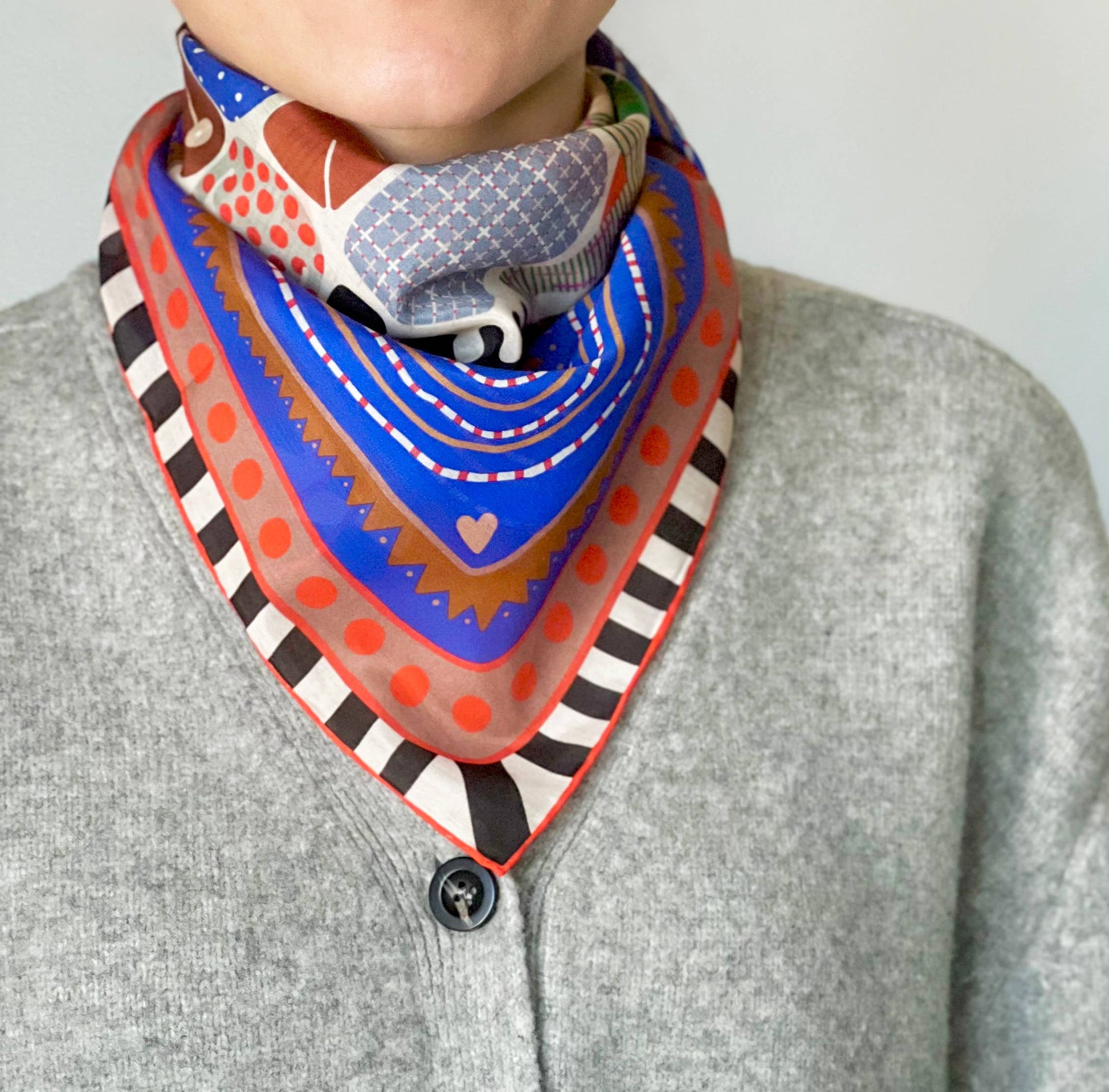 Lightweight & airy with a beautiful drape. Soft to the touch and thoughtfully crafted from eco-friendly materials, each one is designed to care for both you and the world around you. %70 cotton, %30 silk-blend season less fabric. From hand-drawn illustrations to carefully crafted fabrics, each design is made with love and attention to detail. Finished with hand-rolled edges for a smooth, refined look. Designed in San Francisco. Comes with a reusable cotton pouch that allows the textile to breathe and can be used for storage. We recommend dry cleaning to keep your bandana looking its best. If you prefer to hand wash, use lukewarm water and lay it flat to dry. With a little extra care, you'll help preserve its quality and enjoy it for years to come. Imported.