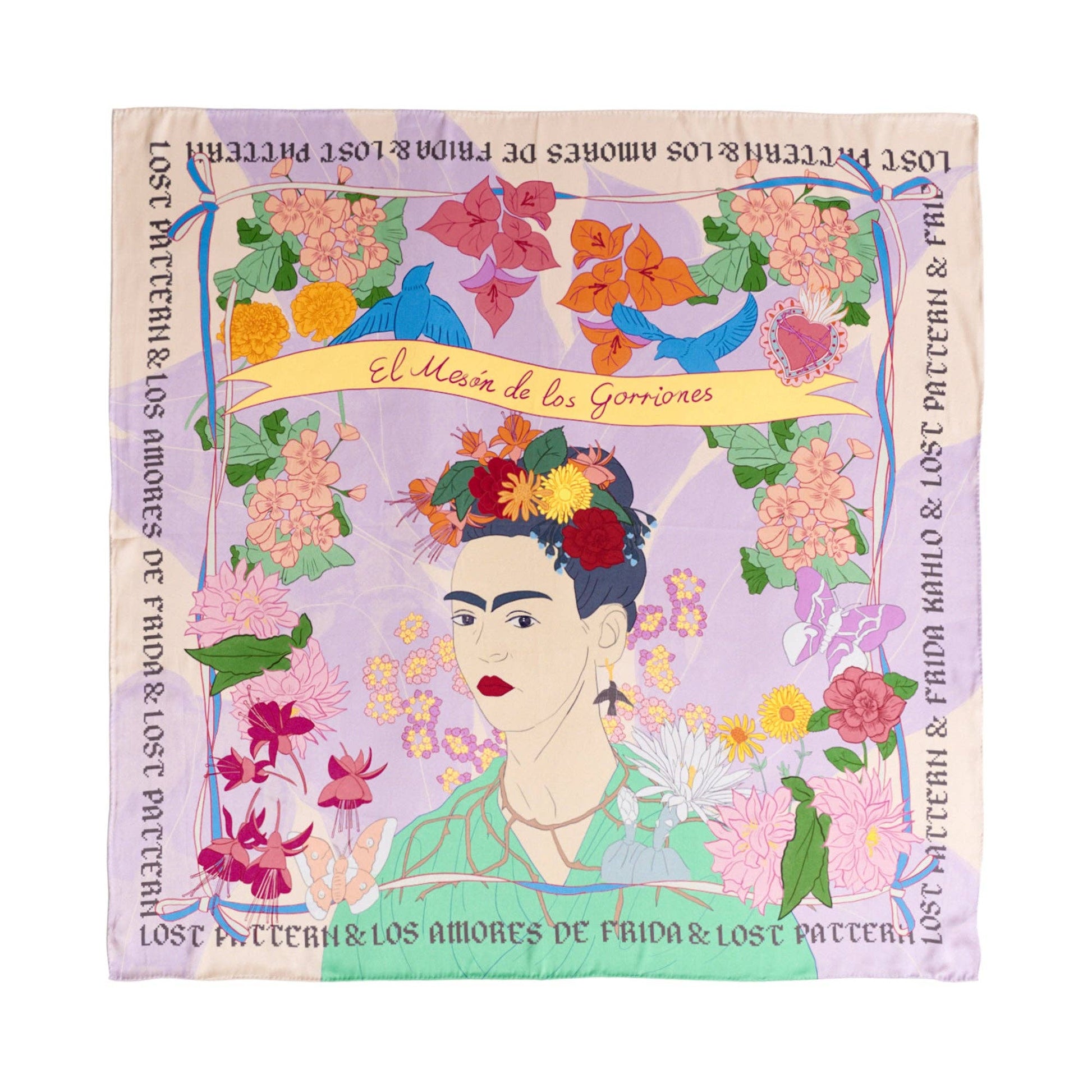 Introducing the "Los Amores de Frida" Large Silk Scarf and our FRIDA X LOST PATTERN collection, a collaboration between LOST PATTERN and the FRIDA KAHLO familia that pays homage to the iconic self-portrait of Frida Kahlo.